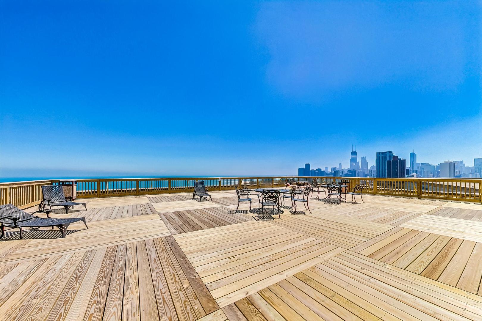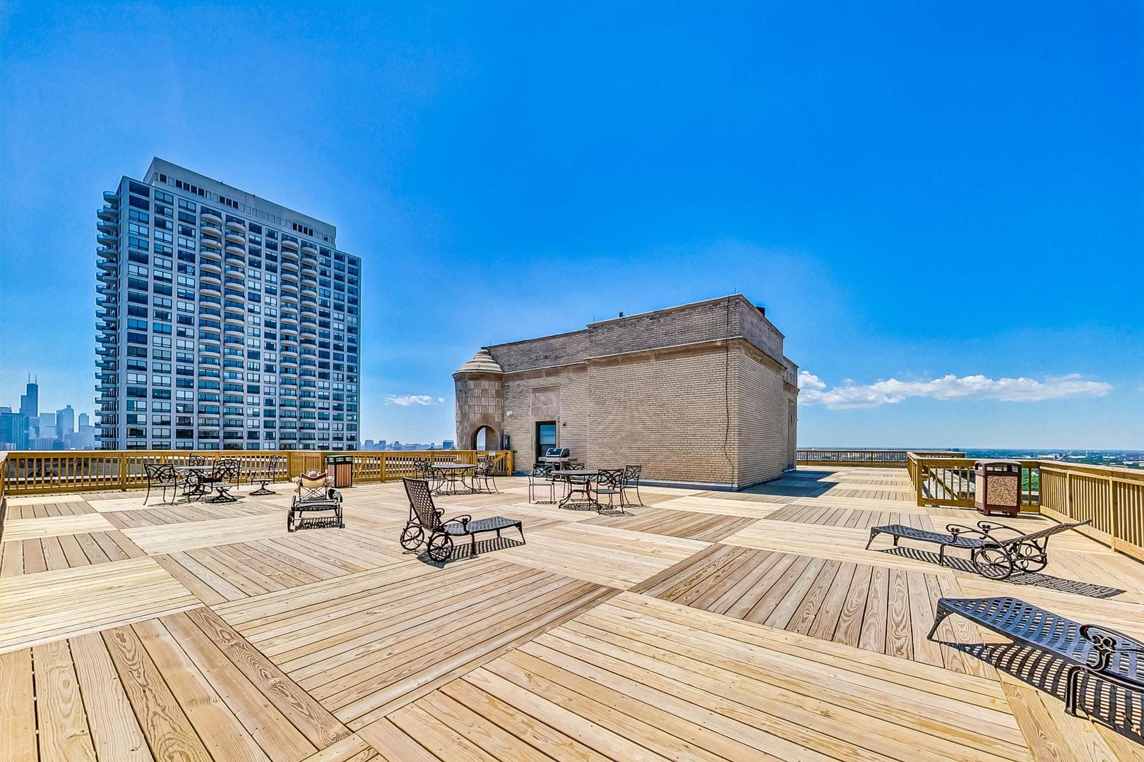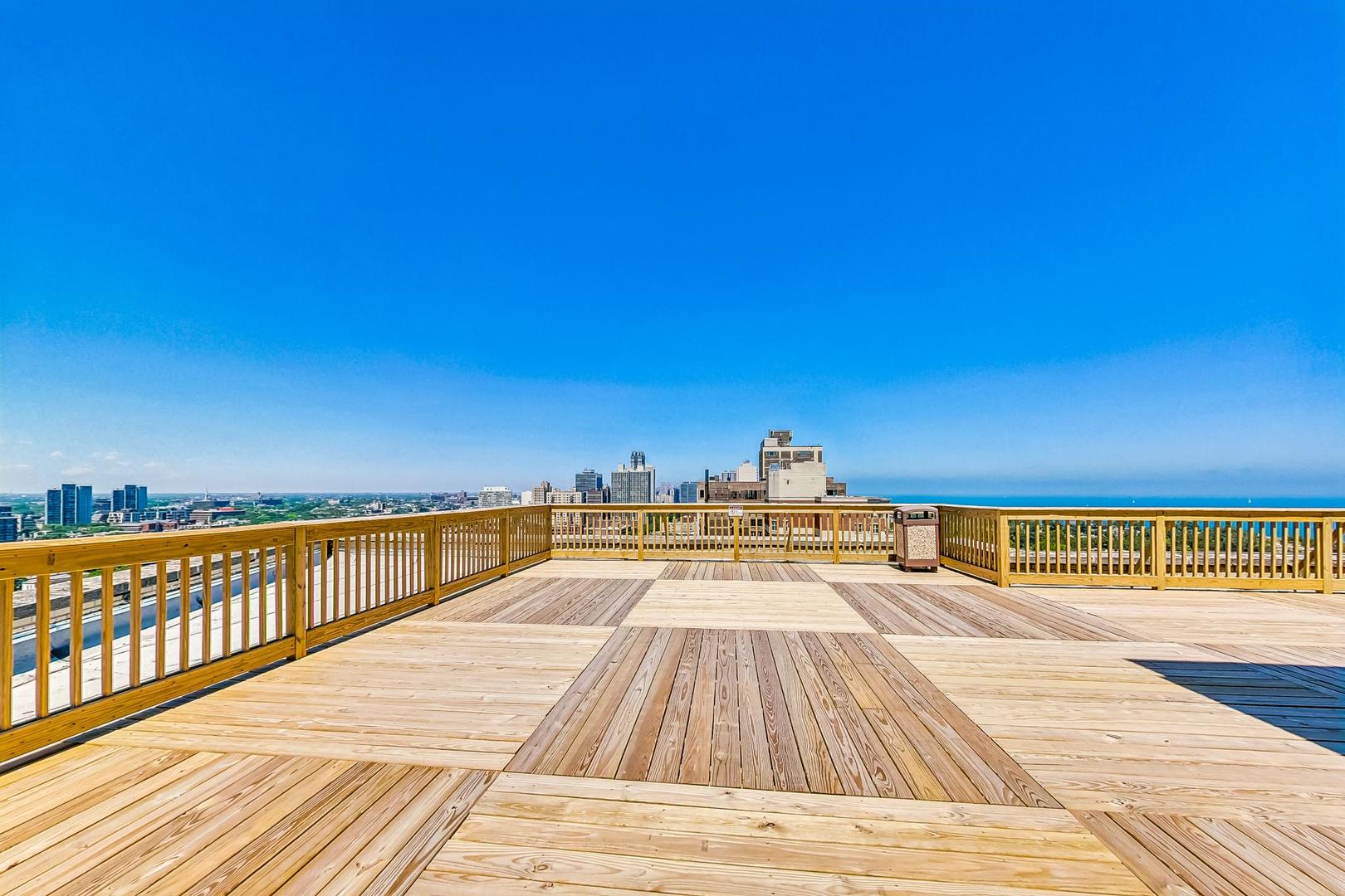 Perched on the 14th floor of iconic 2000 N Lincoln Park West, this west-facing one-bedroom offers sweeping views and unforgettable sunsets with great natural light through oversized windows. The home has just been fully refreshed with new interior paint throughout, refinished parquet hardwood floors, and new lighting to elevate the look and feel. Enjoy vintage charm paired with modern comfort in an unbeatable location. The timeless character of the unit's built-in cabinetry with original hardware offers tons of storage and makes the space feel curated from day one. The bedroom is easily large enough to accommodate a king-sized bed, and the closets are absolutely massive. The sweeping roof deck is the perfect place to entertain and take in the iconic Air & Water Show and Navy Pier fireworks, and it offers a fantastic view of the skyline. Lincoln Park, the lakefront, Lincoln Park Zoo, dining, nightlife, and transit are all right outside your door. This is a timeless full-amenity, pet-friendly building with 24-hour door staff, on-site management/engineering, fitness room, rooftop sundeck, laundry, bike storage, and on-site conveniences including Starbucks and RJ Grunts. Assessments include heat, gas, water, cable TV, and internet. A washer and dryer can be added to the unit, too!