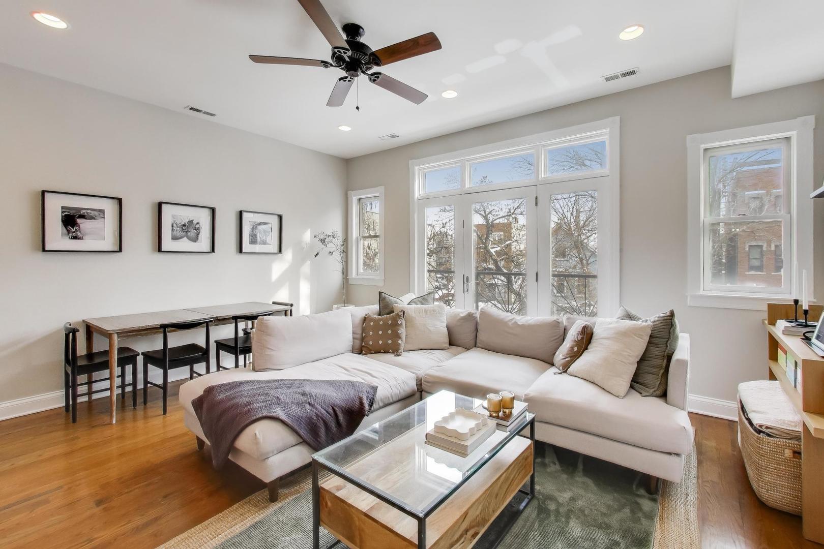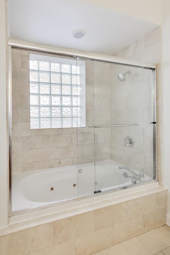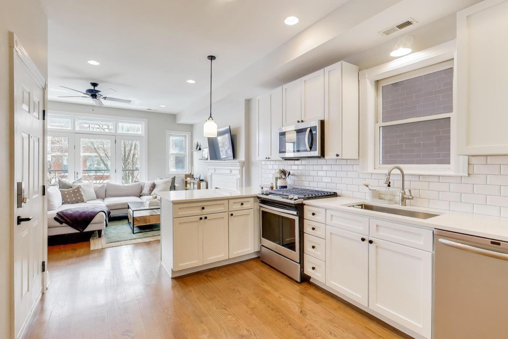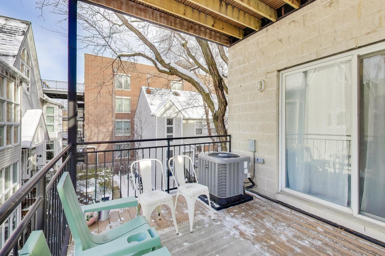 Beautifully updated 2-bed, 2-bath condo in the heart of Lakeview that feels like a true retreat. The open-concept living space is flooded with natural light thanks to a Juliet balcony and the rare benefit of no adjacent building next door. The spacious living room easily accommodates a large sectional and dining table, and features a cozy gas fireplace. The kitchen opens seamlessly to the living area and includes a breakfast bar, refreshed cabinetry, and great flow for everyday living or entertaining. The primary suite offers a private deck accessible from both the bedroom and hallway, plus an en-suite bath with dual vanity and a large jetted tub. Additional highlights include in-unit laundry, additional storage, tandem parking for two cars, and thoughtful aesthetic upgrades throughout, including fresh paint on walls, trim, doors, and molding; updated lighting; new outlets and hardware; refreshed kitchen cabinets and guest bath vanity; and custom window treatments in the guest bedroom and bathroom. All wrapped in a calming, coastal-inspired design that makes coming home feel like an exhale. Enjoy unbeatable access to Southport Corridor, Wrigley Field, public transit, and everything Lakeview has to offer, with peace and privacy at home.