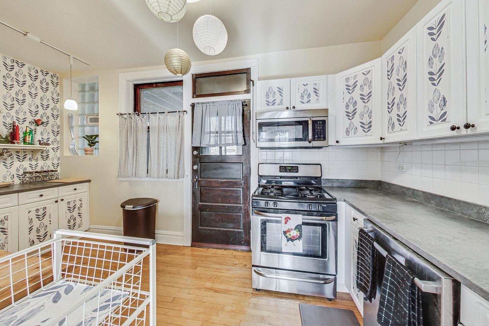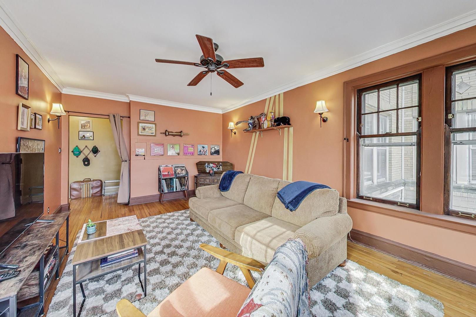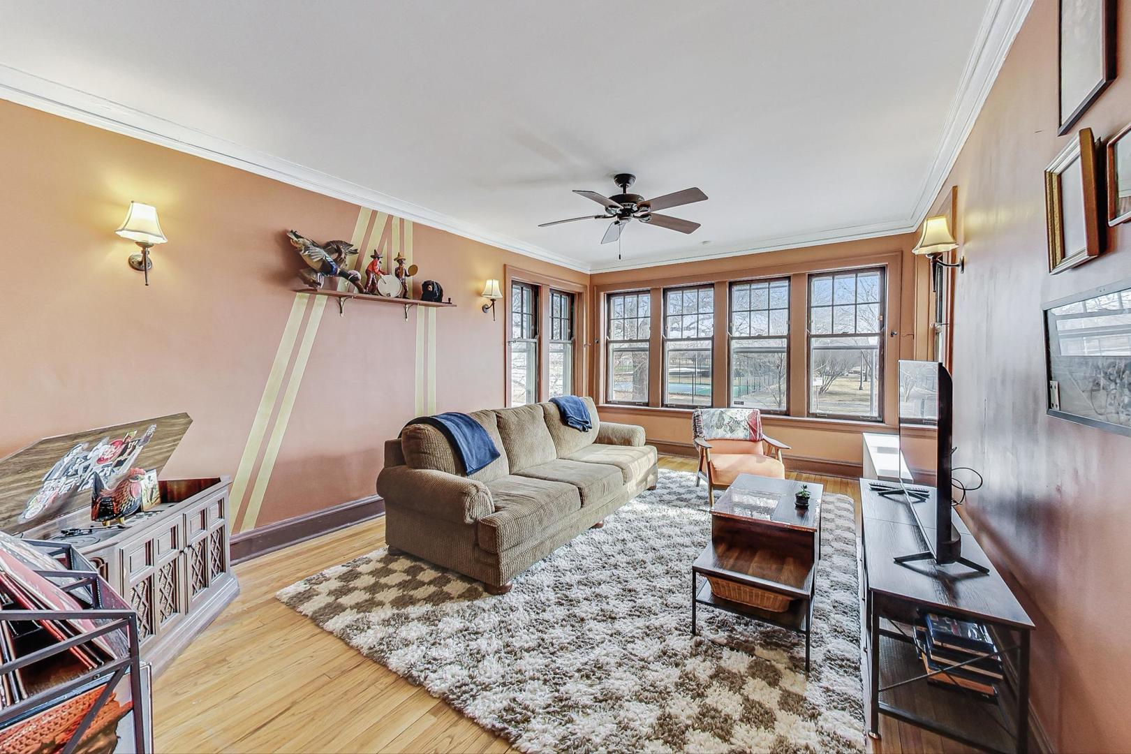 Experience this charming corner unit situated on a one-way street with southeastern exposure and beautiful park views. Tons of morning sun pours in and accents the greenery of Winnemac Park to get your day started off in the best way possible. Expansive rooms, vintage touches, and prime location make this the perfect place to call home. Tasteful updates accent the timeless character of the unit and bring all the modern conveniences you would expect. The south-facing formal dining room and spacious kitchen with stainless steel appliances make for a perfect place to host friends and family. Right off the kitchen is a lovely little back deck to enjoy the summer months, or stroll across the street to the park and enjoy all it has to offer. The unit comes complete with a generously sized storage unit, and the building offers common bike storage and a laundry room equipped with newer washers and dryers. The Metra rail and the Brown Line are great for hassle-free commuting, and you have all the fantastic offerings of Lincoln Square just moments away.