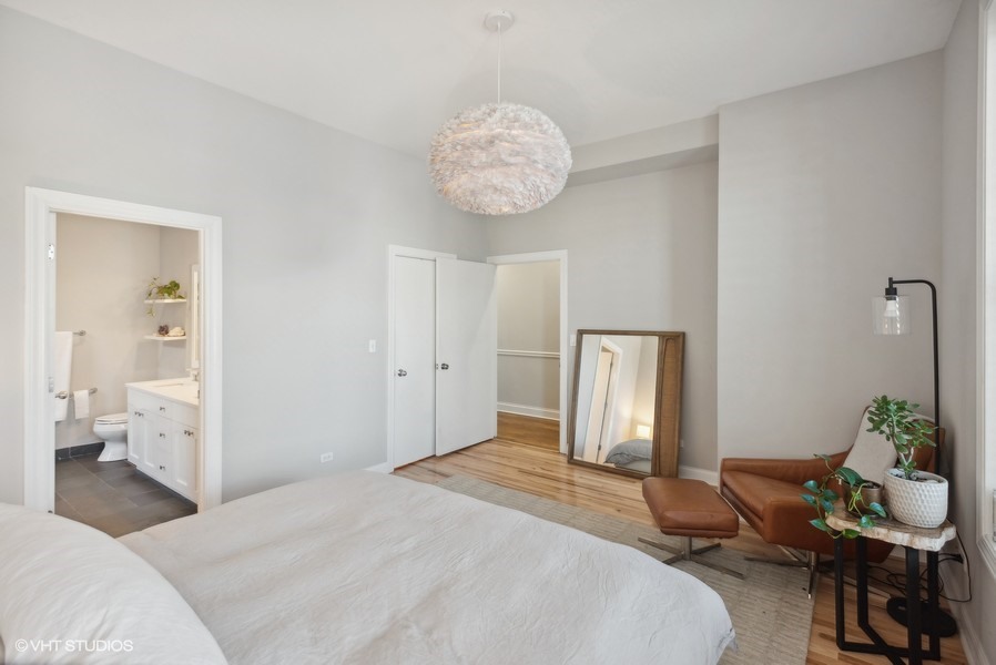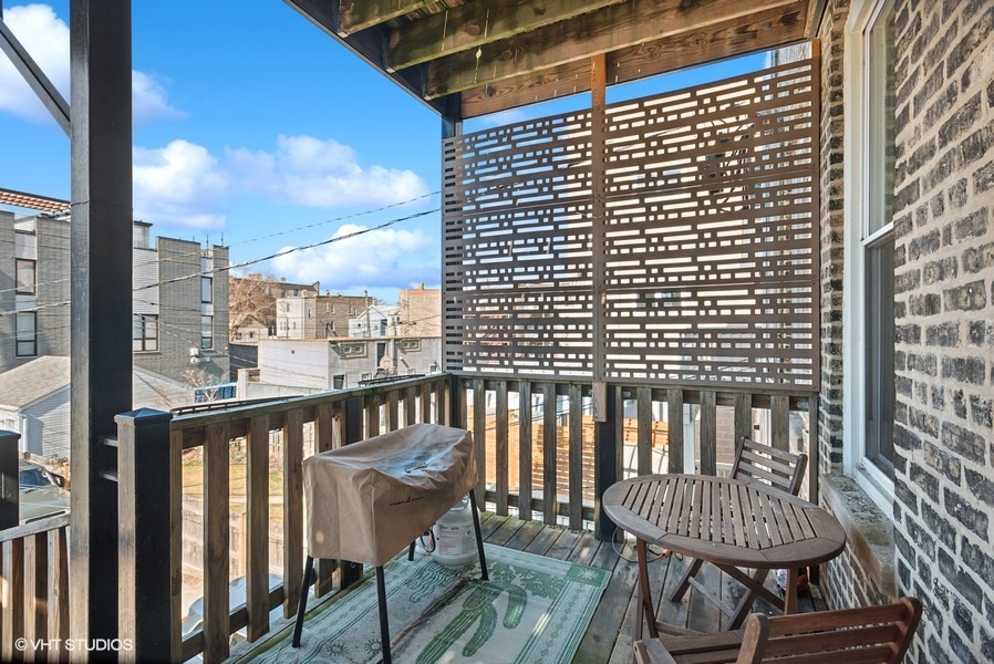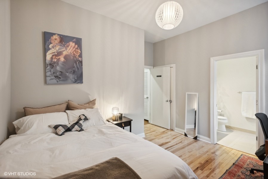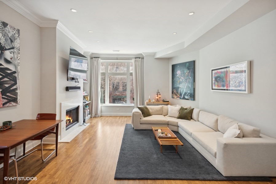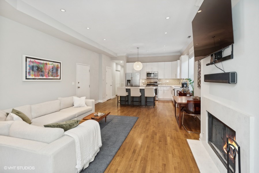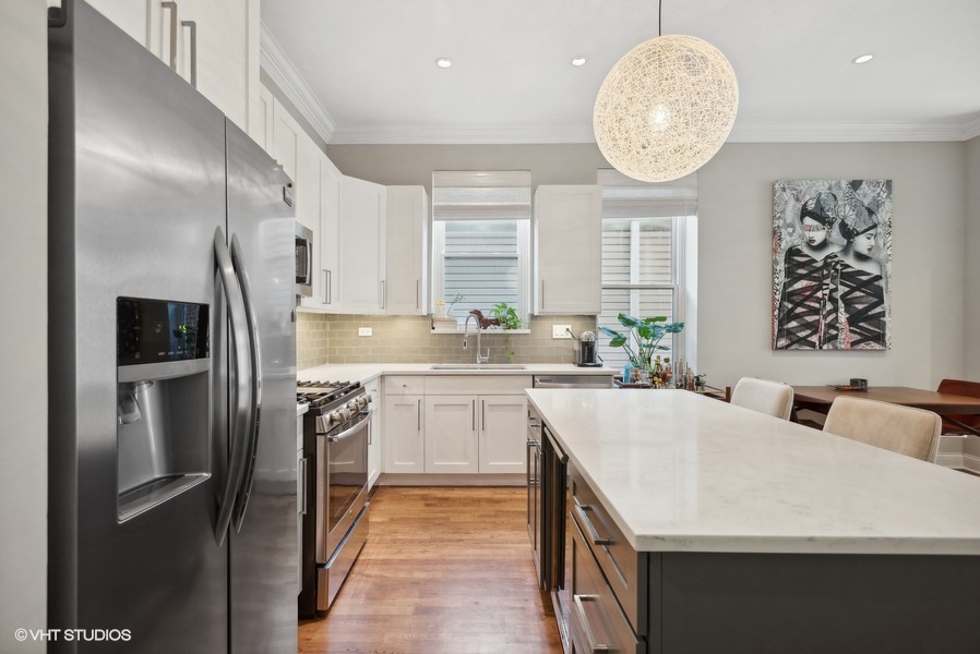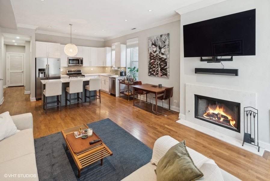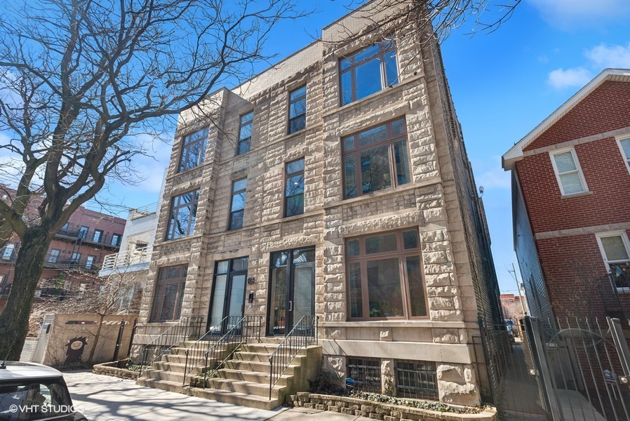 Check out this sophisticated 1,600 sf 2 bed 2.5 bath condo with luxe features and amenities all set in an iconic, turn of the century Greystone building in HOT Noble Square. Extremely thoughtful and spacious layout with tons of storage and closet space. Tastefully updated chef's kitchen (2016) with new stainless appliances, white cabinets w/under-cabinet lighting, gray island with built-in wine/beverage refrigerator, white quartz c-tops with deep sink, subway tile backsplash, and pantry! Extra-wide east-facing living area features a wood-burning fireplace with full quartz facade/ hearth with built in shelving. Plenty of room for a full dining table. Oversized (newer) front windows overlook an idyllic tree canopy. Full laundry room with newer Samsung washer and dryer (2022) with Elfa shelving and ample storage space. Large primary suite with a show stopping 9'x8' walk-in closet (more like dressing room!) with custom Elfa organization system,' shoe/purse shelving. Renovated en-suite primary bathroom (2019) with quartz top double vanity, Grohe faucets, marble tile in shower with separate jet tub. Second bedroom also has an en-suite bath with tub/shower. Bonus powder room/half bath located off of the entertaining (living/kitchen) area, very convenient for guests. Other features include: hardwood flooring throughout, tall ceilings with 6" crown molding, upgraded LED fisheye recessed lighting & designer light fixtures throughout. Newer furnace and AC (2016) and water heater (2018). Rear deck accessible from the hallway and perfect for entertaining. Exterior parking spot included in the price, 1 shared guest parking spot for the building. Massive storage room is also included in the price. A+ location at the doorstep to Fulton Market/West Loop, amazing local foodie destinations such as; Green Grocer, Tempesta Market, Aya Bakery, Coal fire pizza, Bari, Damatos, Publican Bread and Kasama to name a few. Dog park, playgrounds and Eckhart close by, 0.6 mi. to Chicago blue line, 0.4 mi to 90/94 entrance. Don't miss out on the opportunity to own this special place.