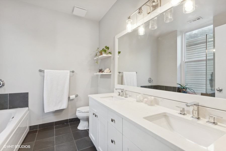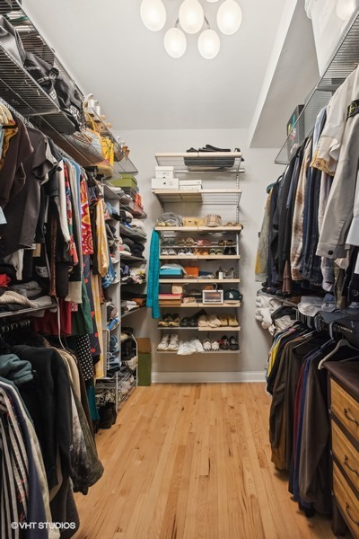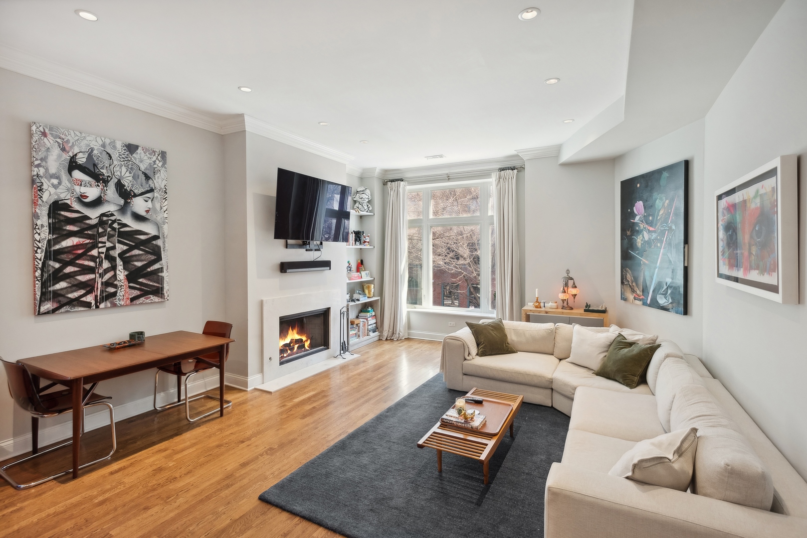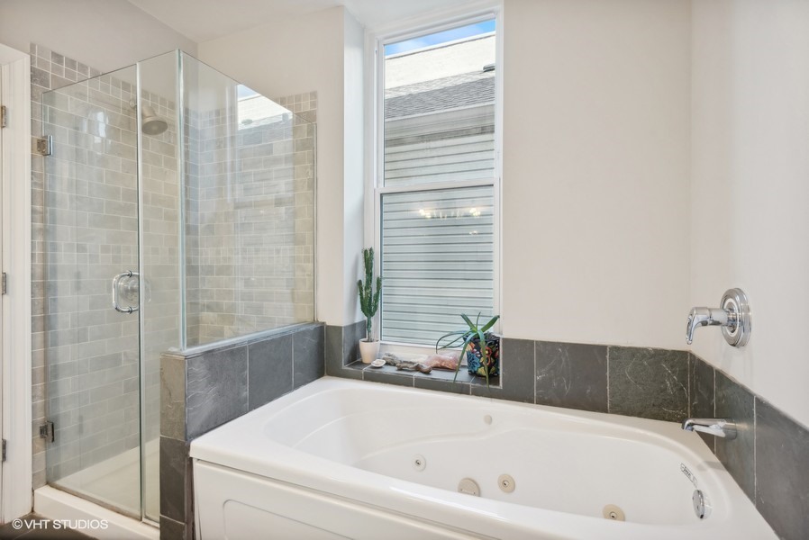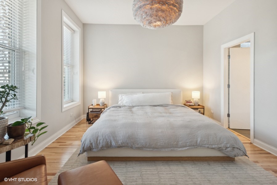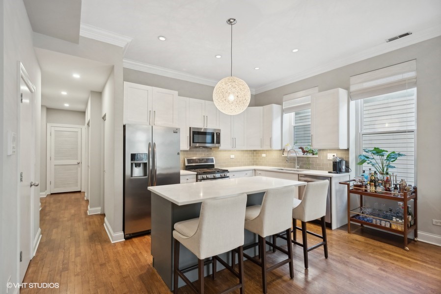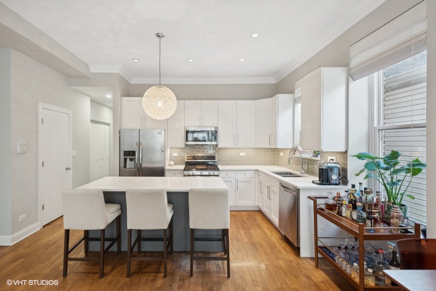 Check out this sophisticated 1,600 sf 2 bed 2.5 bath condo with luxe features and amenities all set in an iconic, turn of the century Greystone building in HOT Noble Square. Extremely thoughtful and spacious layout with tons of storage and closet space. Tastefully updated chef's kitchen (2016) with new stainless appliances, white cabinets w/under-cabinet lighting, gray island with built-in wine/beverage refrigerator, white quartz c-tops with deep sink, subway tile backsplash, and pantry! Extra-wide east-facing living area features a wood-burning fireplace with full quartz facade/ hearth with built in shelving. Plenty of room for a full dining table. Oversized (newer) front windows overlook an idyllic tree canopy. Full laundry room with newer Samsung washer and dryer (2022) with Elfa shelving and ample storage space. Large primary suite with a show stopping 9'x8' walk-in closet (more like dressing room!) with custom Elfa organization system,' shoe/purse shelving. Renovated en-suite primary bathroom (2019) with quartz top double vanity, Grohe faucets, marble tile in shower with separate jet tub. Second bedroom also has an en-suite bath with tub/shower. Bonus powder room/half bath located off of the entertaining (living/kitchen) area, very convenient for guests. Other features include: hardwood flooring throughout, tall ceilings with 6" crown molding, upgraded LED fisheye recessed lighting & designer light fixtures throughout. Newer furnace and AC (2016) and water heater (2018). Rear deck accessible from the hallway and perfect for entertaining. Exterior parking spot included in the price, 1 shared guest parking spot for the building. Massive storage room is also included in the price. A+ location at the doorstep to Fulton Market/West Loop, amazing local foodie destinations such as; Green Grocer, Tempesta Market, Aya Bakery, Coal fire pizza, Bari, Damatos, Publican Bread and Kasama to name a few. Dog park, playgrounds and Eckhart close by, 0.6 mi. to Chicago blue line, 0.4 mi to 90/94 entrance. Don't miss out on the opportunity to own this special place.
